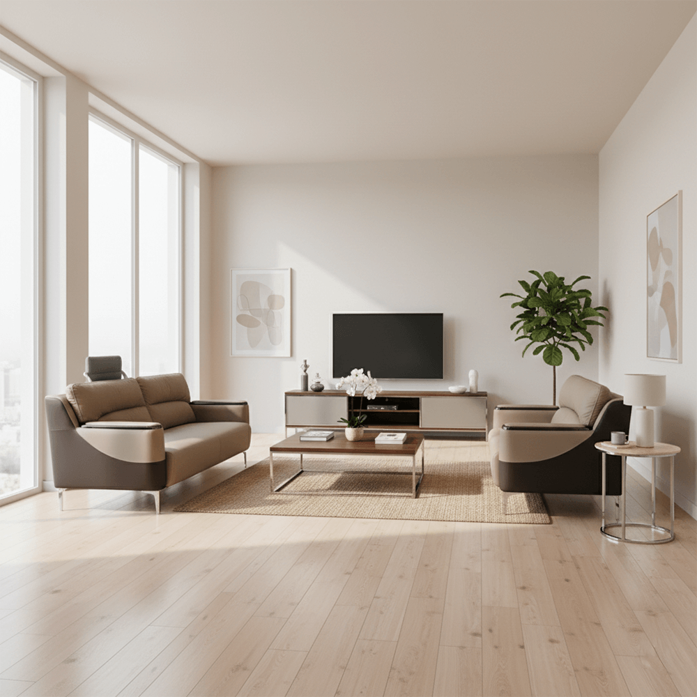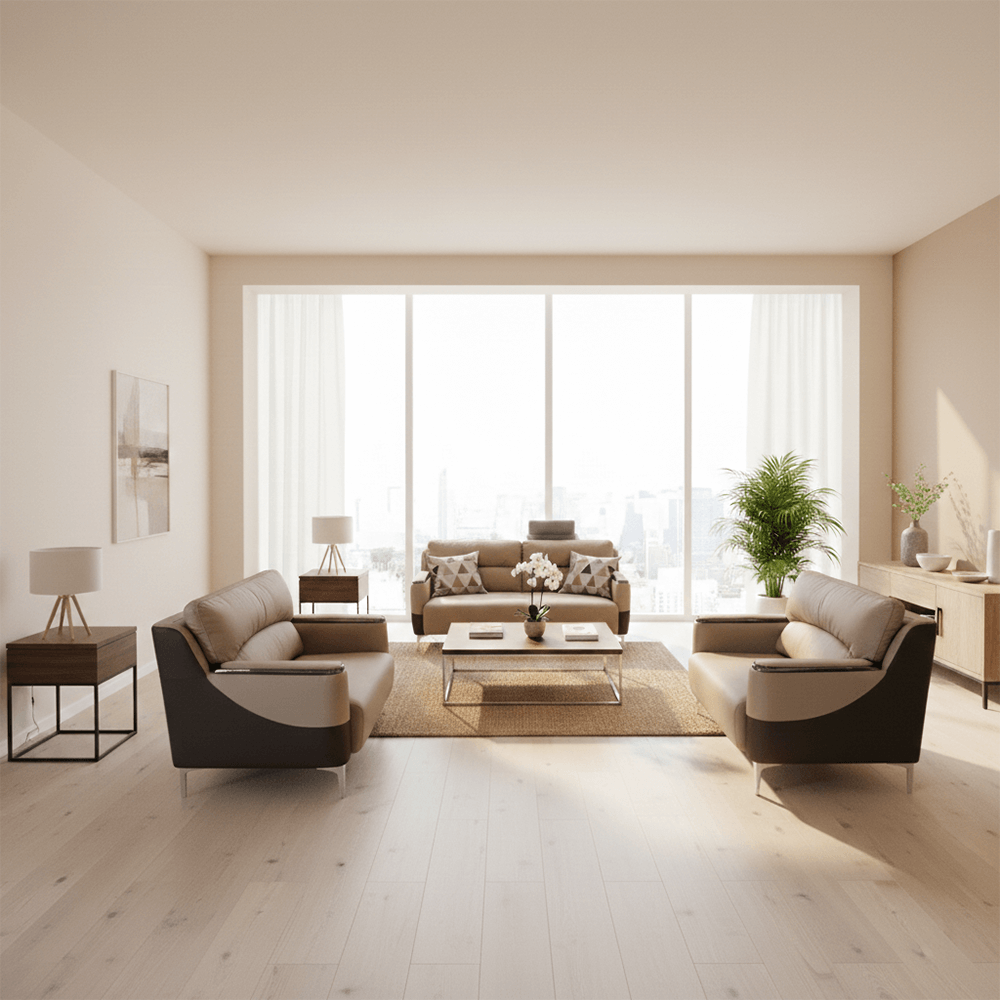 Redefine the atmosphere of your hospitality or executive space with the Amaranth Sofa Set. This collection is a masterclass in modern geometry, featuring a striking two-tone coffee and cream leatherette finish that demands attention without overwhelming the room.