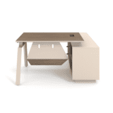 - Floating Aesthetic: The desk surface is elevated by discrete risers above the storage unit, creating a “floating” look that adds lightness to its robust construction.