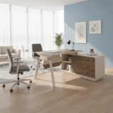 The Drew Oak Manager Table is more than just a desk; it is a statement of professional intent. Designed for the contemporary executive, this L-shaped workstation combines a minimalist aesthetic with heavy-duty utility. The striking contrast between the creamy matte chassis and the rich, wood-grained oak top creates an atmosphere of calm authority. Featuring an integrated side return, the Drew Oak ensures your workspace remains expansive and clutter-free, allowing you to focus on the big picture.