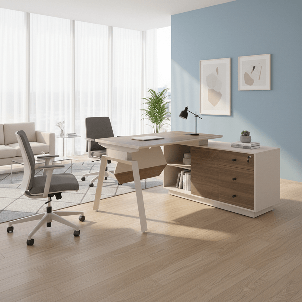 - Integrated Storage Suite: The side cabinet features a mix of open shelving for quick access and three precision-glide drawers—including a top-tier locking drawer for sensitive documents.