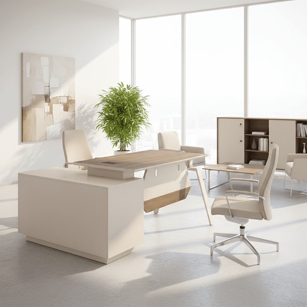 Master the art of modern leadership with a workspace that balances bold geometric design and sophisticated functionality.