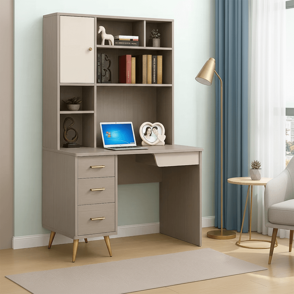 - Signature Gold Hardware: Each drawer is adorned with premium horizontal gold pull-handles, while the hutch cabinet features a matching minimalist gold knob for a cohesive, upscale look.