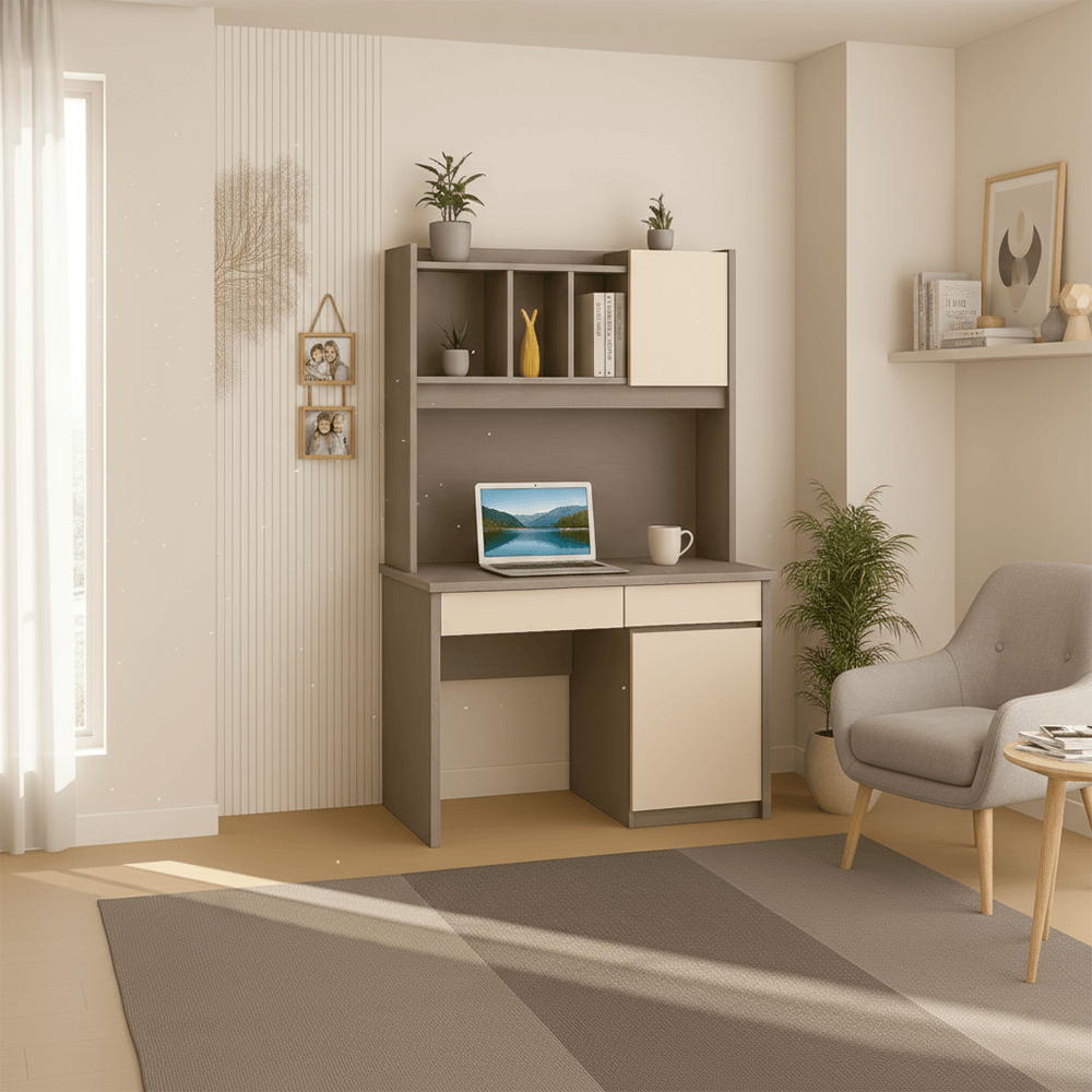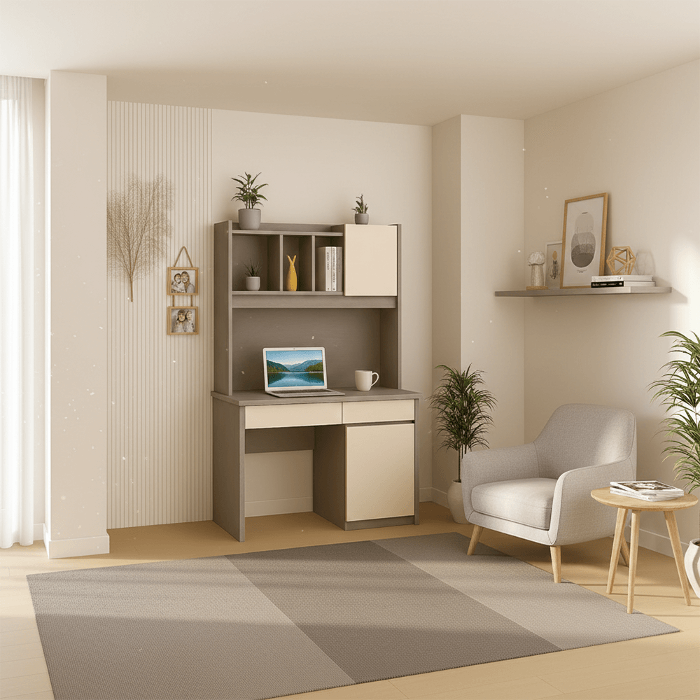 The Marigold Study Desk is more than just a piece of furniture; it’s a productivity powerhouse. Crafted for students and professionals alike, this desk features an integrated hutch and multi-functional storage compartments, all wrapped in a calming, muted grey and cream palette. Its vertical design maximizes your floor space while keeping all your essentials within arm’s reach.