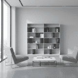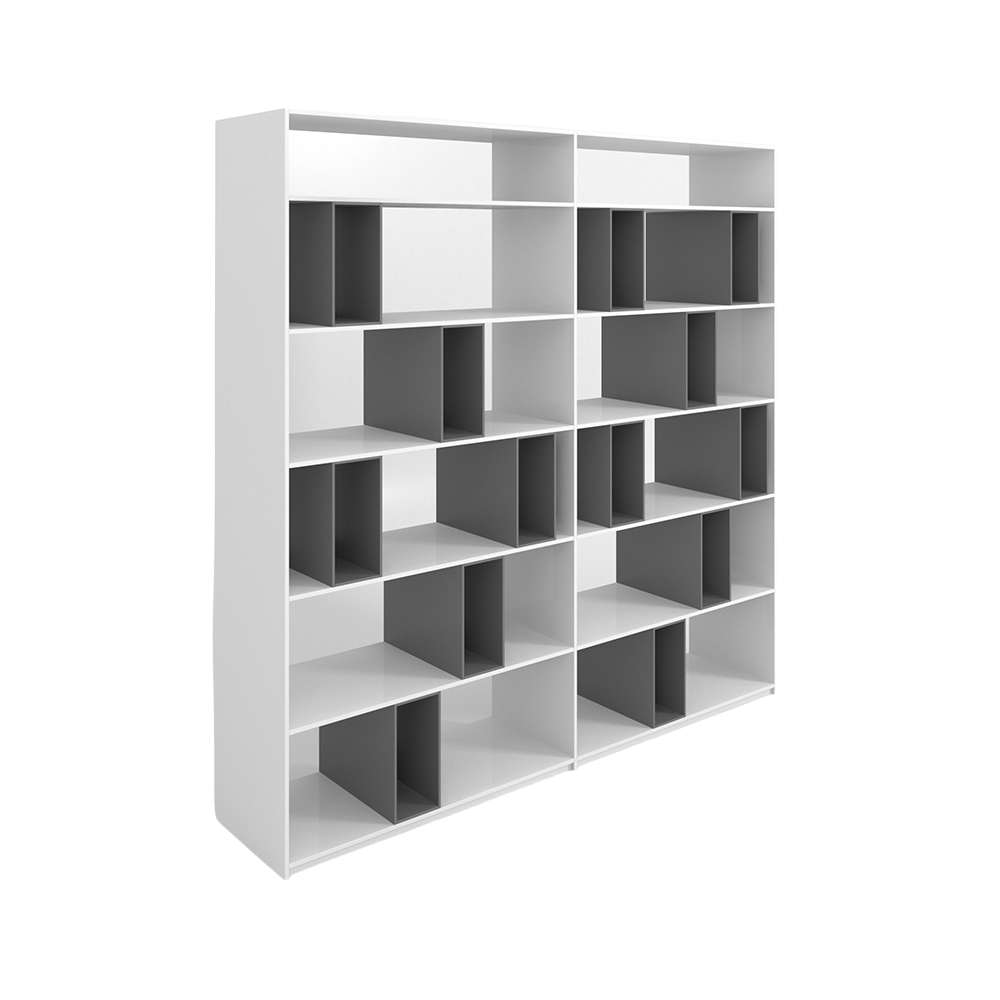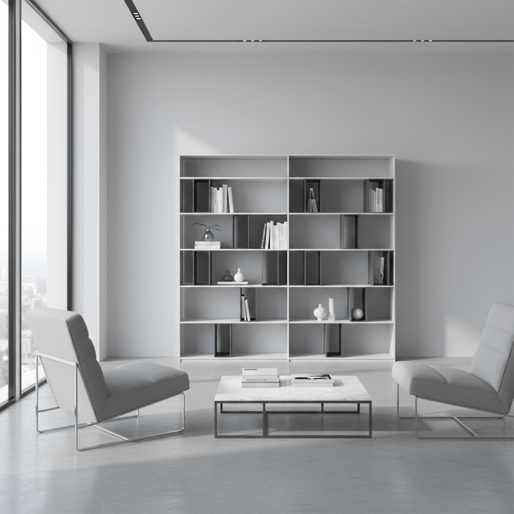 • Dual-Tone Contrast: The sophisticated matte white exterior is punctuated by deep charcoal inserts, providing a perfect backdrop for books, ceramics, or art pieces.