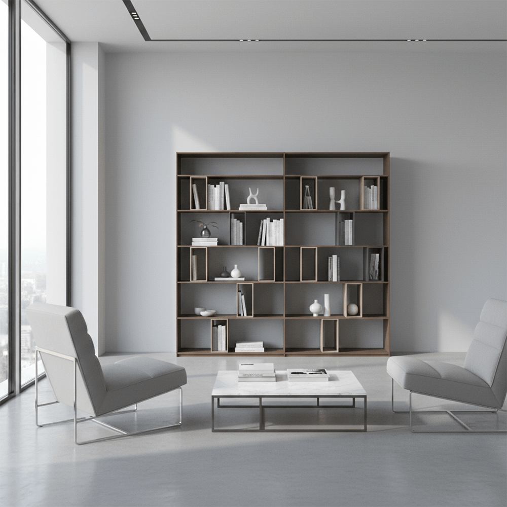 Elevate your space with a masterpiece of rhythmic design. The Quincy Cabinet isn’t just a shelving unit; it’s a functional sculpture that plays with light, shadow, and negative space.