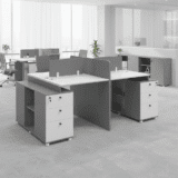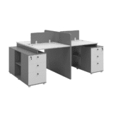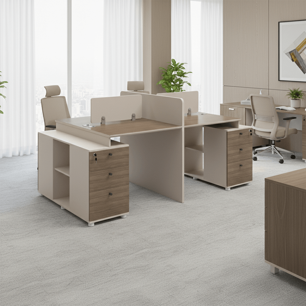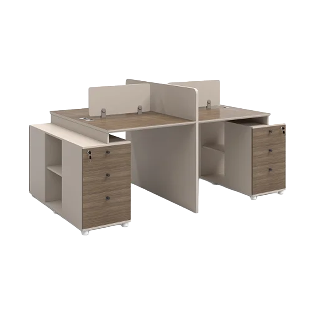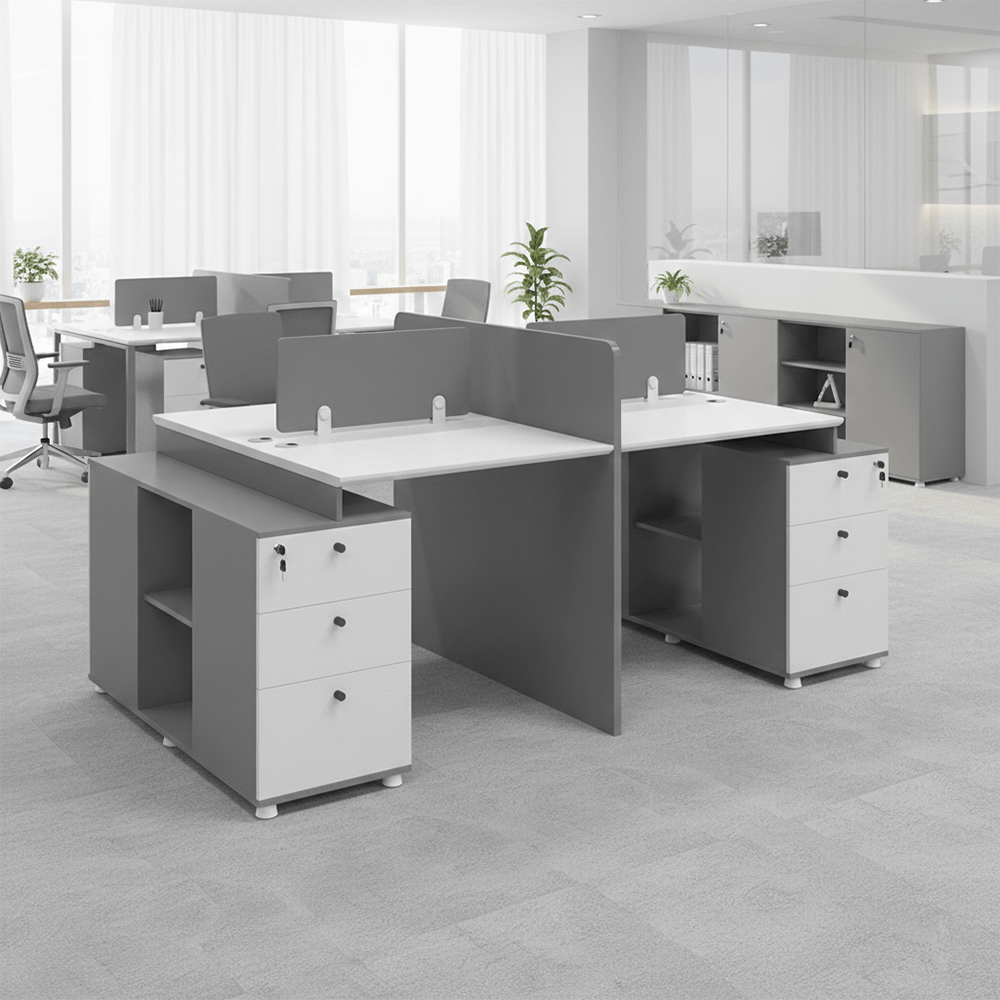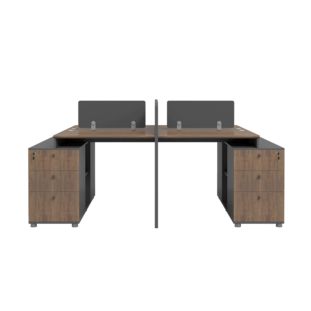 • Secure Storage Pedestal: A shared central cabinet features four deep-drawers with independent locking mechanisms to keep sensitive files and personal belongings safe.