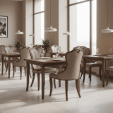 The sophisticated “greige” upholstery is meticulously stitched to create vertical channels that draw the eye upward, while the dark, polished wood frame provides a grounded, masculine contrast. Whether you are outfitting a boutique hotel dining room or a high-end residential breakfast nook, the Valetta Wing offers a “sit-in” experience that encourages guests to linger over dessert and conversation.