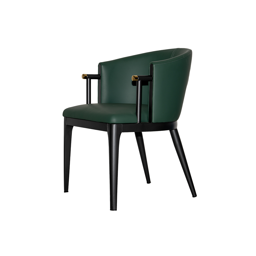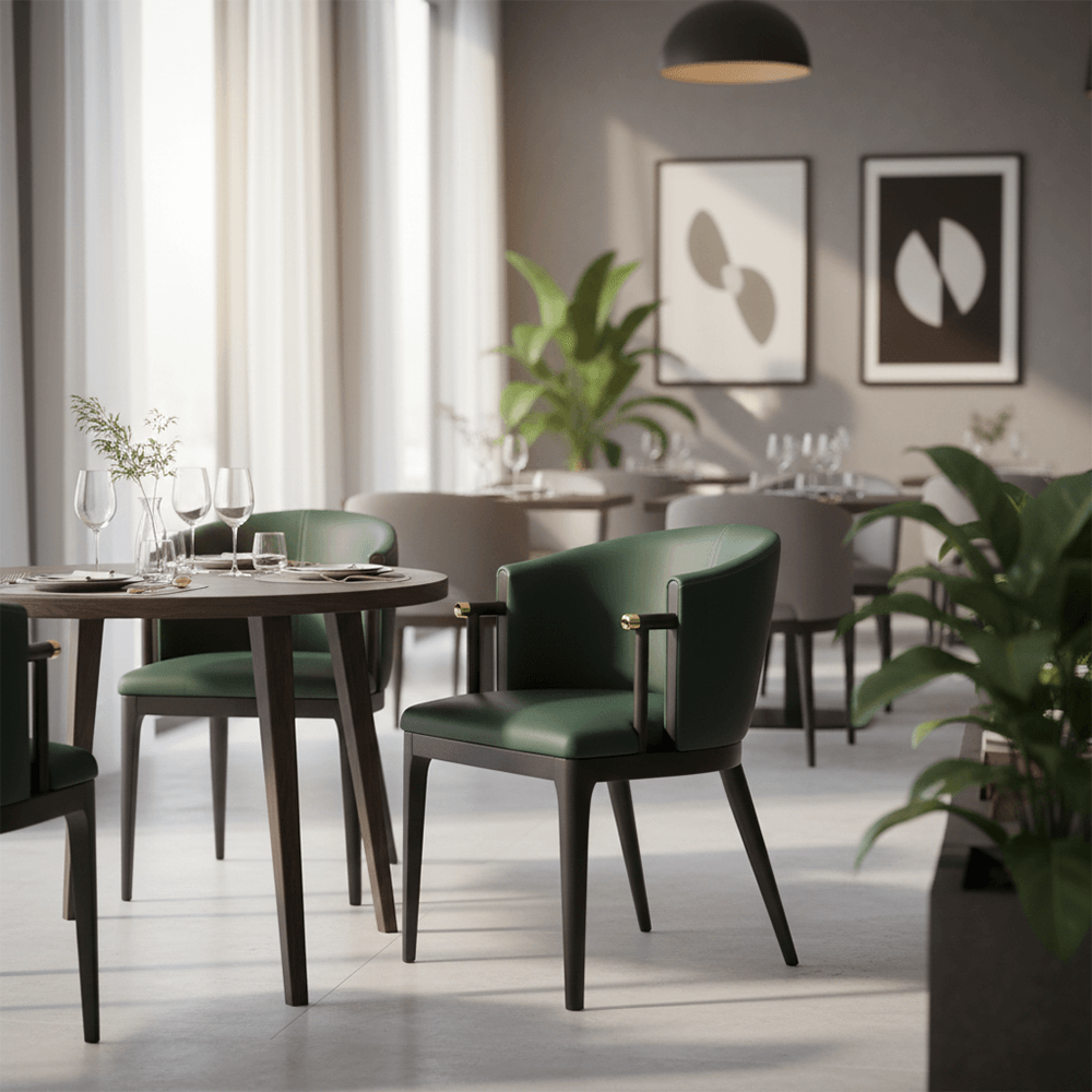 The Viridian is built for the “Golden Hour.” It thrives under dim, warm lighting where the gold accents can catch the glint of a candle and the deep green leather can soften into a rich, dark shadow. It is durable enough for a busy restaurant floor but refined enough for a luxury home.